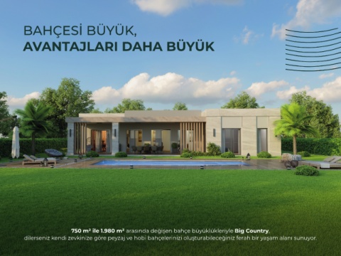 BAHÇESİ BÜYÜK, AVANTAJLARI DAHA BÜYÜK 750 m² ile 1.980 m² arasında değişen bahçe büyüklükleriyle Big Country, dilerseniz kendi zevkinize göre peyzaj ve hobi bahçelerinizi oluşturabileceğiniz ferah bir yaşam alanı sunuyor.